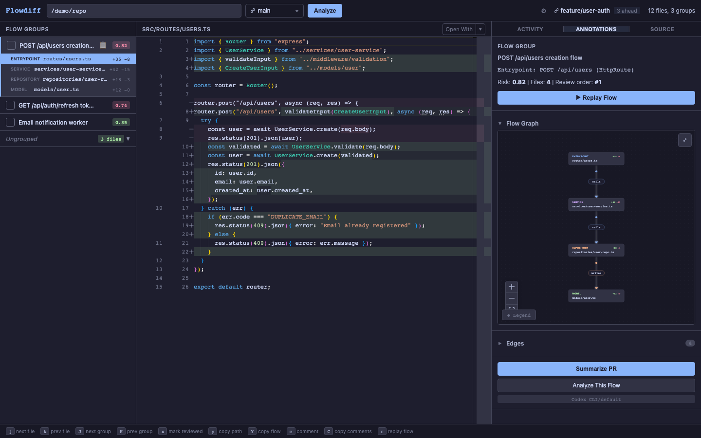 Build a structural model from the git diff, detect entrypoints, and rank the review by the flows that matter instead of raw file order.